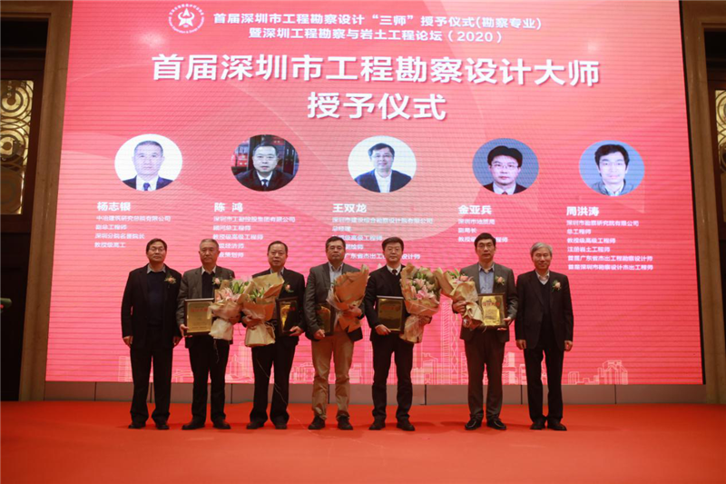 2020年12月22日,由深圳市勘察設(shè)計行業(yè)協(xié)會主辦的首屆深圳市工程勘察設(shè)計“三師”授予儀式(勘察專業(yè))暨深圳工程勘察與巖土工程論壇(2020)在福田區(qū)隆重舉行。深圳市住房和建設(shè)局副局長高爾劍、中國工程院院士孟建民出席會議并講話。會議為深圳市勘察設(shè)計行業(yè)的17位專家授予“三師”稱號,工勘巖土集團顧問總工程師沈孝宇、工勘集團總工程師陳鴻、工勘巖土集團副總經(jīng)理李新元分別獲評為首屆深圳市工程勘察設(shè)計功勛大師、勘察設(shè)計大師、勘察設(shè)計杰出青年。